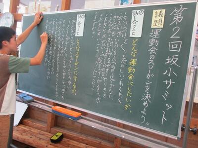 全校みんなで話し合う坂小サミットを開きました。今回の議題は運動会のスローガンについてでした。1~6年生みんなが自分の思いや考えを発表しました。その結果、スローガンは「魂(たましい)をふるわせろ!全力運動会!」に決まりました。坂本小の子どもたちらしい元気いっぱいの運動会を期待しています。