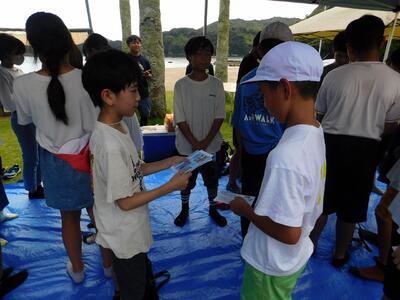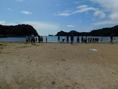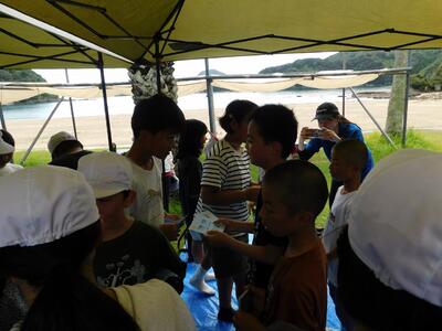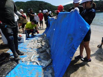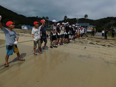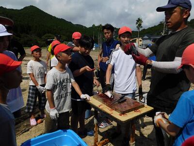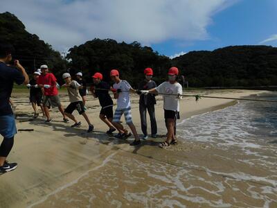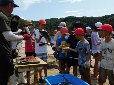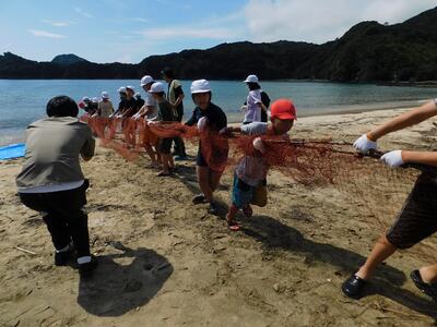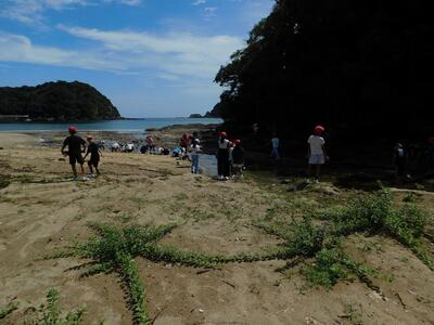 坂本小、上組小、北浦小の5・6年生が合同で、須美江海水浴場にて地引き網体験をしました。きれいな海岸で様々な種類の魚を獲った子どもたちは、終始興奮していました。また、北浦小の子どもたちともすぐに打ち解け、素敵な交流ができました。獲った魚はフライにしていただき、カレーライスに乗せていただきました。