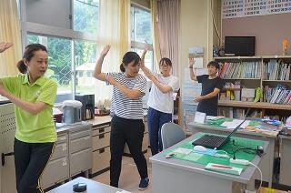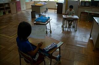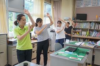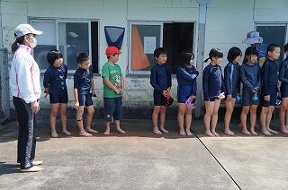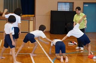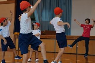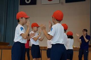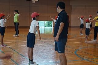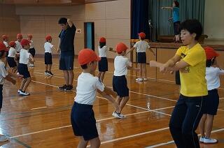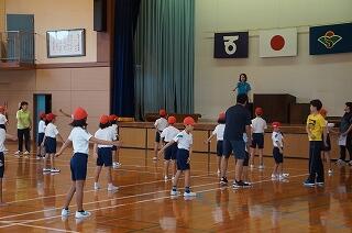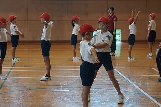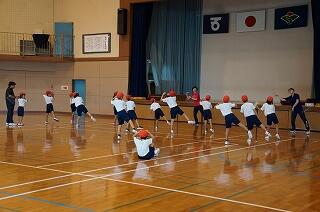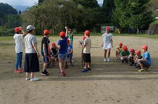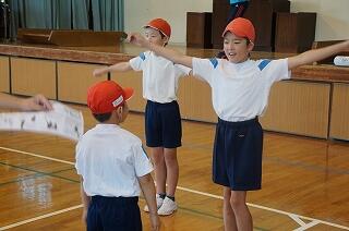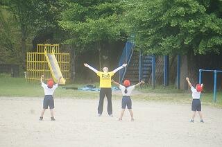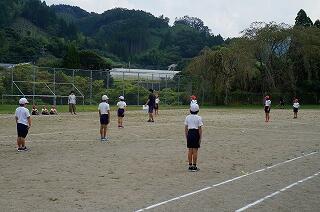 1年生(全3名)が運動場で、ラジオ体操をしていました。「体操隊形にひらけ!」の合図で広がって、