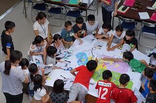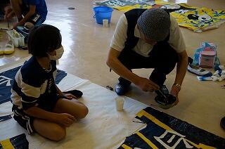 本日、3・4時間目に運動会で使用する団看板(絵)の作成を行いました。この作業には、毎年、ゲスト
