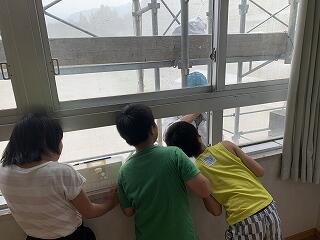 工事の方もこんな近くに子どもたちの顔があると照れるでしょうね~(*^▽^*)工事の皆様!すみません<(_ _)>