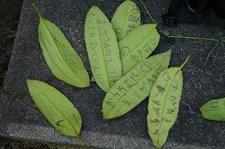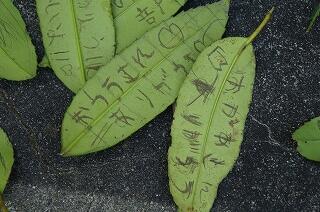 今回は、實行さんに教えていただいた、たくさんの遊びの中から、「多羅葉・・たらよう」の葉を使った遊びを紹介します。