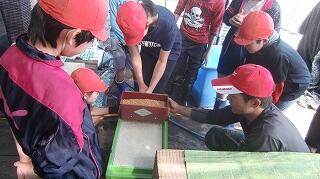 シートに種を均等にまいて、その後、立っている種を寝かせるように、慎重に水をかけていきました。この作業が、子どもたちにとっては難しかったようです(_ _)