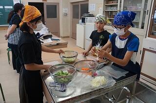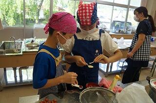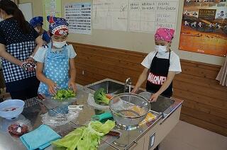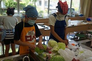 5・6年の家庭科の授業を覗いてみました。調理実習の真っ最中で、「カラフルゆで野菜サラダを作ろう」というめあてのもと、みんな頑張って実習を進めていました。