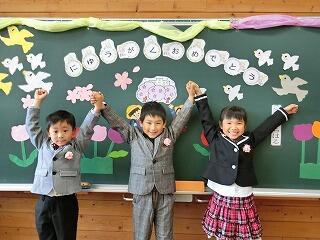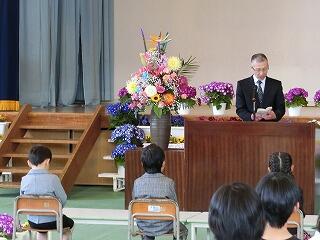 4月11日(木)に、3名の新入生を迎えての入学式が行われました。かわいらしい新入生の入場に、来賓の方々や職員、在校生が思わず、笑顔になりました。3人の新入生は、校長先生や来賓の方々、振興会会長の話をしっかりと聞いていました。