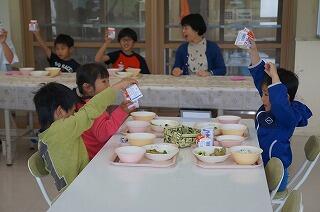 こちらもてきぱきとやっていき、すぐにできあがりました。このあと、誕生日を迎えたお友達や先生を紹介し、一言ずつ話をしてもらいました。そして、ハッピー バースデー トゥ ユーをみんなで歌い、牛乳乾杯をしました(*^▽^*)