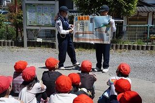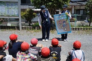 10連休明けの初日は、下学年と上学年に分けての交通教室を行いました。今までよく経験してきた交通教室は、運動場にラインで横断歩道を描き、信号機の模型を置いたり、見通しの悪さを実感させるために車を置いたりして、そこをどう確認しながら歩行するのかというものばかりであったと思います。