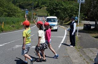 本校の交通教室は、実際に日々利用している登下校路上で行いました。とても実践的で、「ここではどう渡れば良いのか。」「どのように確認を行えば良いのか。」など、警察署の方や交通指導員の方々に、具体的に指導していただきました。