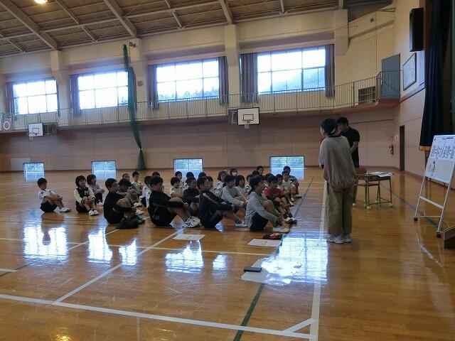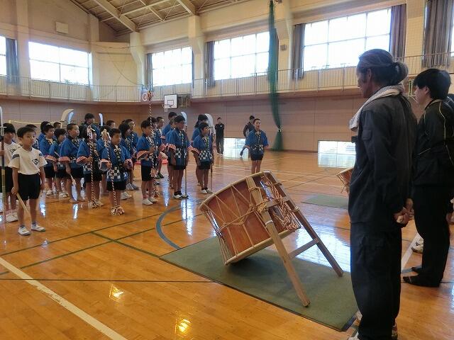 本校では、特色ある教育活動として「荒踊」を参観していただきました。普段と同じように講師の先生方に細かい動きも教えていただきました。そして、今回から1年生も継承教室に参加して初めての荒踊を体験しました。6年生が見本となって1年生に教えてあげる姿が見られました。