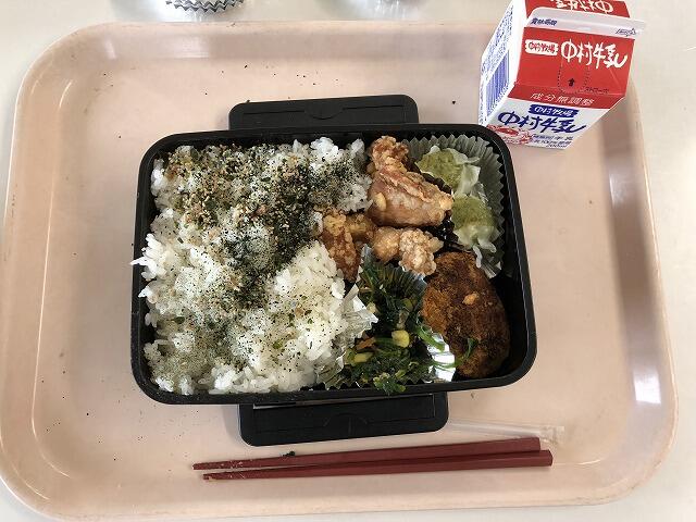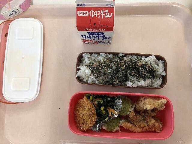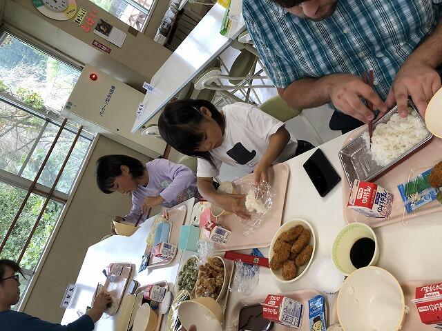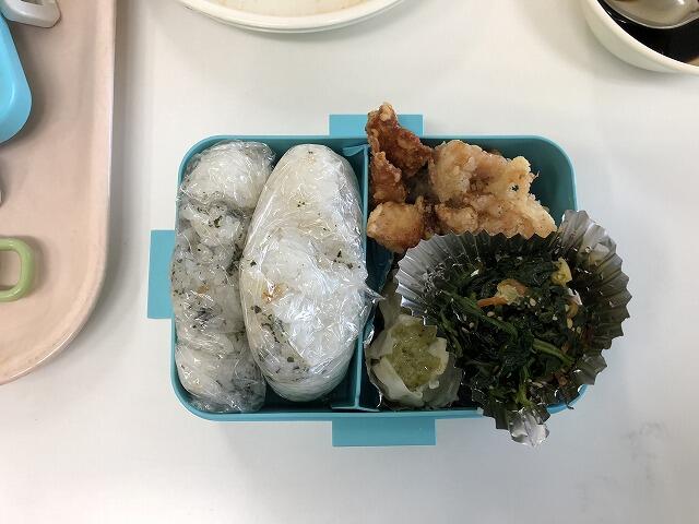 給食の時間に「弁当詰め活動」を行いました。給食のおかずを自分のお弁当に詰めたり、ご飯をおにぎりにしたりする活動です。