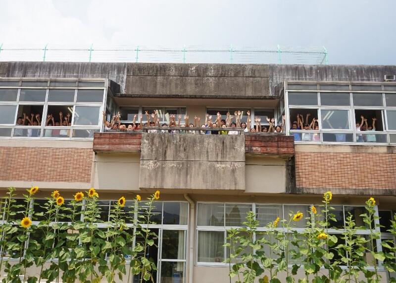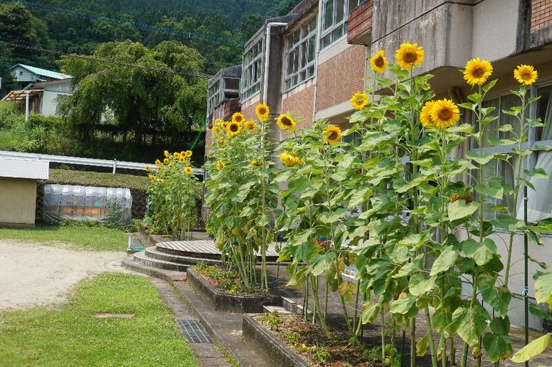 さらに、校庭のひまわりが満開になったので、全校児童で記念写真を撮りました。