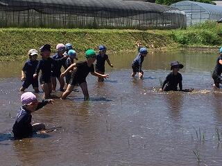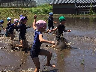 子どもたちも楽しみにしていたどろリンピックは、天気にも恵まれ、予定どおり行うことができました。初めて田んぼに入る子どもたちもいて、最初は、おそるおそるゆっくりの子どももいましたが、だんだんと慣れてくると、思いっきり走ったり、田んぼの中に寝転がったりする子もいてダイナミックに体全体を使って遊ぶ姿が見られました。終わったあとは、「楽しかった~」「またしたいなあ」という声も聞かれました。