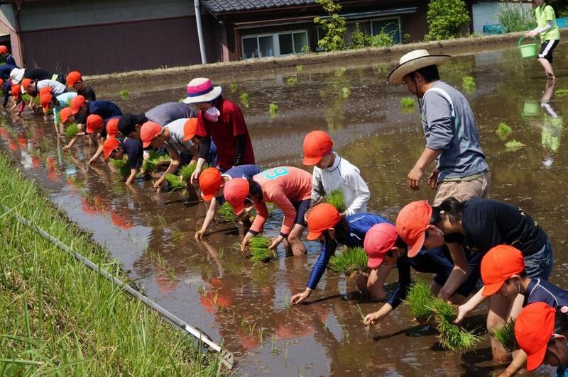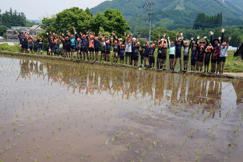 今年度も学校おたすけ隊の長田慎司さんのご指導のもと、保護者の方々にもお手伝いをしていただき、全校児童で田植えをしました。