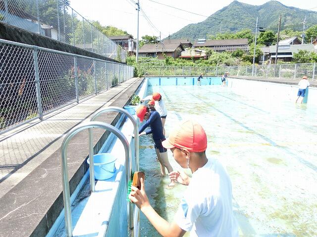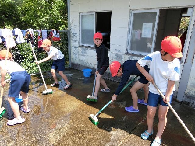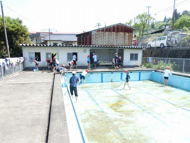 2年生から6年生までの児童で、更衣室や倉庫、広いプールを一生懸命に掃除しました。