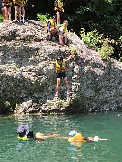 子どもたちは、鞍岡道の上河畔で、カヌー体験、タイヤチューブでの川下り、大岩からの飛び込みなど、夏ならではの体験をしました。