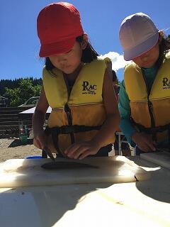 五ヶ瀬自然学校の先生の指導のもと、子どもたちは、初めてヤマメに触れたり、調理したり、試食したりする体験を通して、五ヶ瀬町の夏の自然を体全体を使って楽しみ、そのよさに気づくことができたようでした。