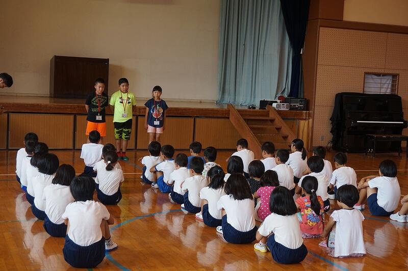 また北海道の新得町から3人の友達が交流に来たので、全校朝会の後に交流活動がありました。