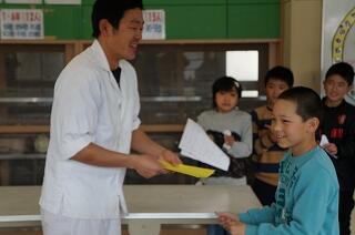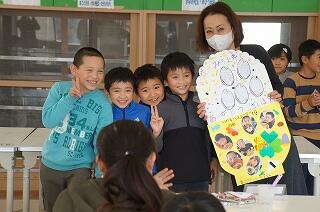 本日、日頃お世話になっている給食調理員の健夫さんやパンを作っていただいている垣内さん、そのほか様々な物資を届けていただいている皆様に感謝の気持ちを表そうと、給食感謝集会を開きました。