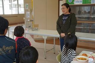給食感謝集会の流れで、わくわくランチへ突入。米粉パンを作ってくださっている垣内さんと本校の給食調理員の健夫さんがゲストになりました。