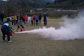 「おはしも」の約束をしっかり守って避難した後は、消防署の方から避難の仕方や防火についての具体的な話を伺い、3人の代表児童が消火器を使っての消火体験をしました。