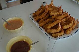 ジャンボエビフライ、イカとエビとブロッコリーの炒め物