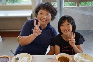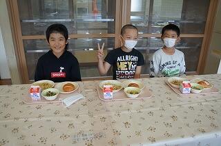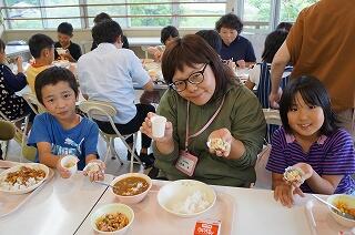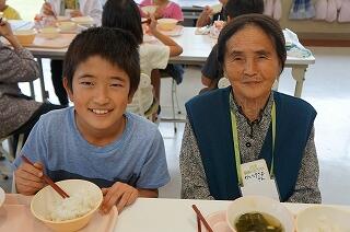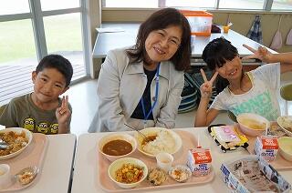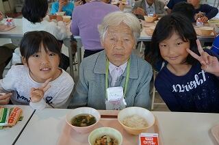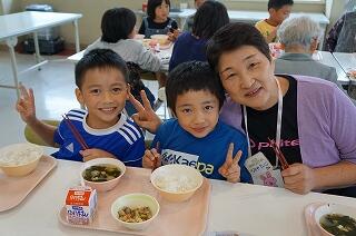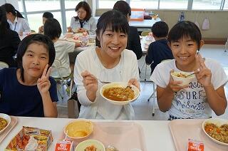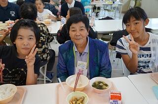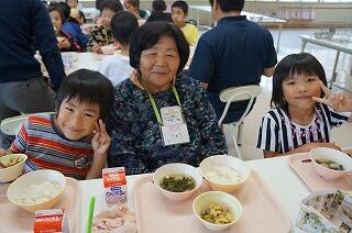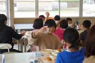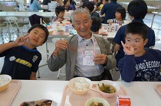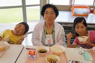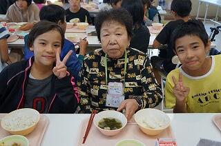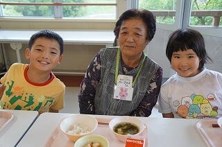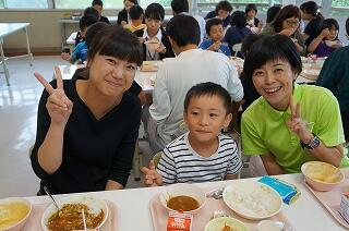 わくわくランチ、3組目は、地域の皆様です。荒踊り継承教室の先生方(西川さん・吉村さん)、そして、本日の3・4年生の「大豆を使ってクッキング」の指導者の先生(伊藤陽子さん)です。