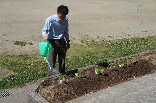 本校の3・4年生の担任の先生が理科の学習で取り扱うひょうたんの苗を丁寧に植えておりました。ヘチ