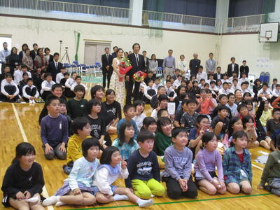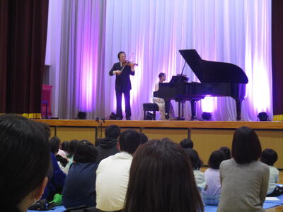 5月2日(木)、五ヶ瀬中学校の体育館にて「ふれあいキャラバンコンサート」が実施されました。ヴァイオリン奏者の徳永二男さん、ピアノ奏者の林絵里さんによる演奏を聴くことができました。世界的にも有名なヴァイオリニストの演奏に、子どもたちはずっと聴き入っていました。また、コンサートが終わった後に記念撮影もありました。