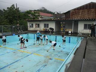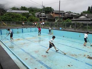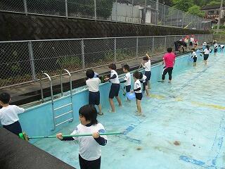 6月18日(火)のプール開きに向け、全校みんなでプール掃除をしました。主に1~3年生がプールサイドを、4~6年生がプール内を磨きました。たわしやバケツ、デッキブラシを手に、少しひんやりとする水を使いながら、みんな一生懸命に掃除をしました。力を合わせてきれいにしたプールでの水泳学習を、子どもたちは楽しみにしていることでしょう。