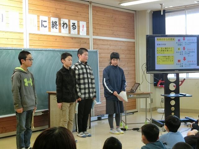 五ヶ瀬の資源として活用できそうなジビエ、森林、農業で、年間を通したイベントを開催し、五ヶ瀬町外の人にも「おかえり」と毎年のように迎えられるようにし、盛り上げていきたいと考えを述べました。緊張している場面も見られましたが、プレゼンを効果的に使い、高学年らしいスピーチができました。