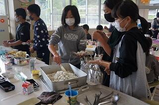 バイキング給食ですよね~。これを自分が持ってきた弁当箱に詰めていきます。おにぎりを作って、おかず