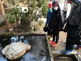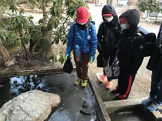 なかなか入ってきません。玄関口に行ってみると、校舎入り口の池の周りで何やら大騒ぎ(O_O)よく見ると、