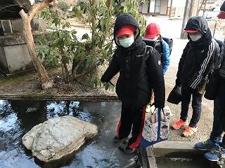 池の上に立っている子どもがいますよ~(O_O)そうです。池がカチカチに氷ってしまっていました。その氷