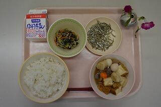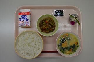 今日は、「ごぼう」の話です。ごぼうには、食物せんいが含まれています。食物せんいは、血液の流れをよくする働きやお腹の調子を整える働きがあります。また、今日のサラダは、歯ごたえがあるので、良くかむことが必要です。よくかむことは、歯やあごを丈夫にしてくれたり、頭の働きをよくしてくれたりします。しっかりとかんで、給食をおいしくいただきましょう。