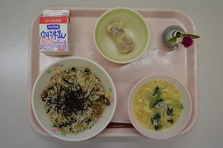 今日は「卵」の話です。卵は、体をつくるもとになる食品で、たんぱく質を多く含んでいます。たんぱく質の他にも、鉄や亜鉛、ビタミンB2を多く含んでいます。ビタミンCだけが、ふくまれていないので、ビタミンCを多くふくんだ野菜などと一緒に食べると、栄養のバランスがよくなります。今日は卵とじにしています。味わっていただきましょう。