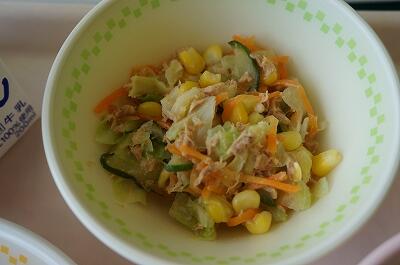 今日はメニューが多いですよ~。先ずは、コーンご飯。コーンの甘味がおいしいご飯です。コーンのシャキシャキ感もいいですね。