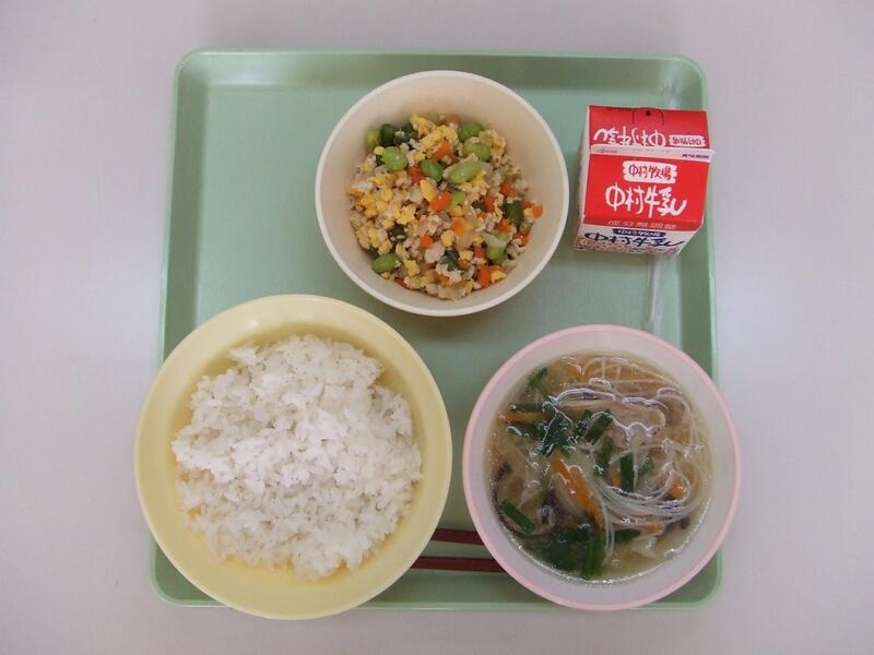 6年生が修学旅行中のため、少し寂しい感じのする給食の時間でした。しかし今日のメニューは、グリーンピースや人参、卵など色とりどりの食材を使った、見た目も鮮やかなとりそぼろ丼でした。汁ビーフンはつるつるとしたビーフンの食感がとてもよかったですよ。