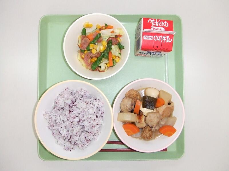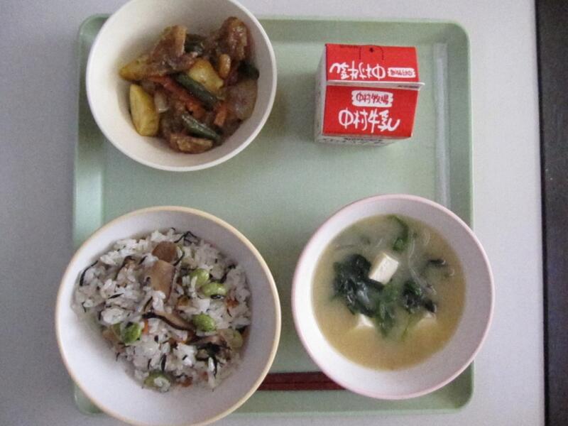 今日の給食には、秋の野菜をふんだんに使った煮物が出ました。