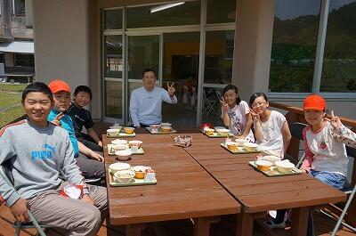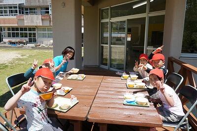5月5日はこどもの日ということで、今日の給食ではミニたいやきがありました。子どもたちも早くごはんやおかずを食べて、ミニたいやきをおいしそうにほおばっていました。今日は天気も暖かく、6年生児童がテラスで給食をいただいていましたよ!