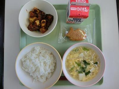午前中は全校での体力テストがあり、子どもたちも力を出し切って頑張っていました。その分お腹も減っていたことでしょう。午後から耳鼻科検診もあったため、いつもよりも早く食べ終わっていました。豚肉とピーマンの炒め物は、人参のオレンジとピーマンの緑色が鮮やかで、とてもおいしかったですよ!