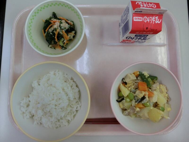 今日の給食は、野菜や肉など食材が豊富です。いろいろなものをバランスよく食べることで、ひとつでは足りない栄養素がとれたり、味がおいしくなったり、栄養素が吸収されやすくなったりします。