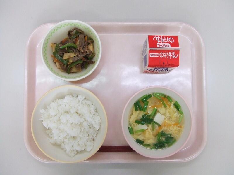 今日のおかずは、チンジャオロースーです。チンジャオロースーの「スー」は、細切りという意味です。牛肉、竹の子、ピーマン、にんじんといった栄養のバランスのとれた具材を使って調理されています。3時間目あたりから、とてもいいかおりがしており、子どもたちの食欲も高まっていました。