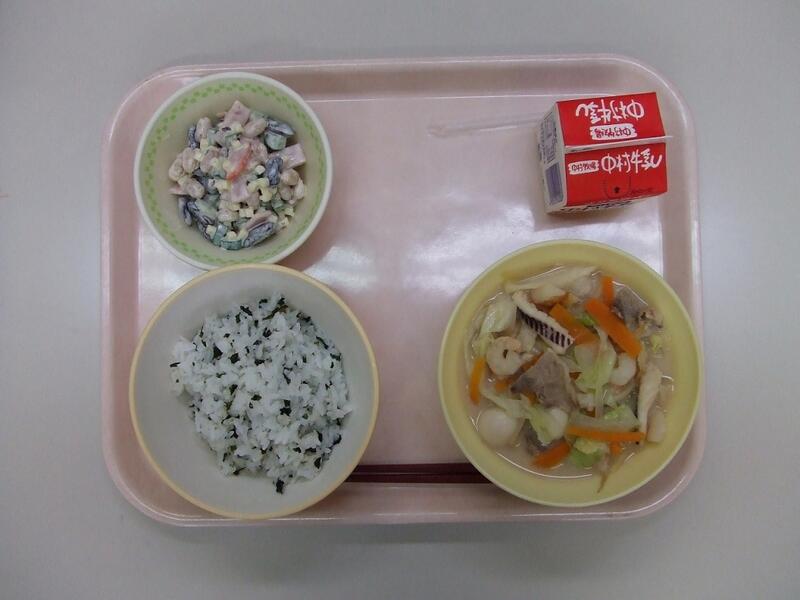 今日のちゃんぽんには、えびが入っていました。ところで、日本はアメリカとならんで「えび」をたくさん食べる国です。そして、えびは国内産だけでなく、外国からも多く輸入されているそうです。子どもたちは、えびのプリプリした食感を味わっていました。