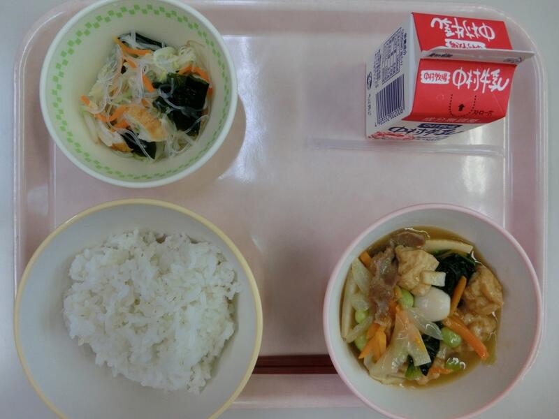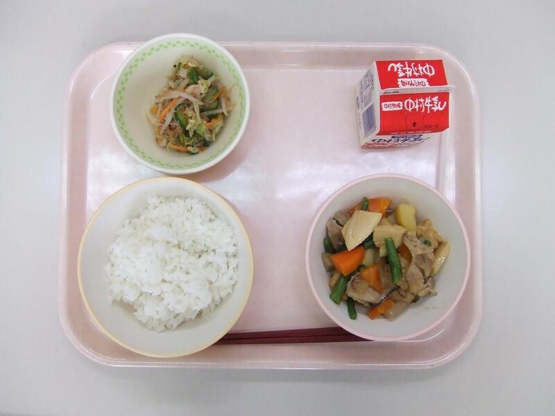 今日の給食は、野菜や肉など食材が豊富です。いろいろなものをバランスよく食べることで、ひとつでは足りない栄養素がとれたり、味がおいしくなったり、栄養素が吸収されやすくなったりします。