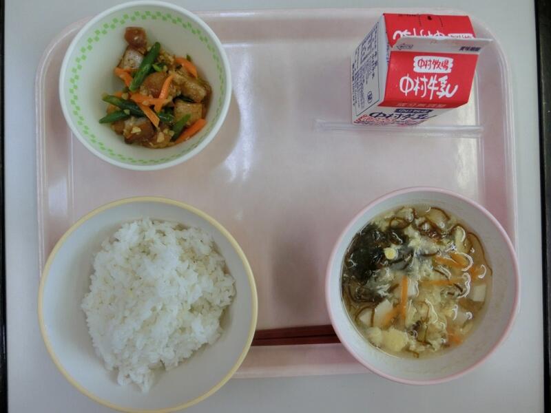 サンラータンは四川料理の一つです。「酸(さん)」はすっぱい、「ラー」は辛い、「たん」は澄んだスープという意味です。本場はとても辛いのですが、給食では辛みをおさえています。子どもたちは、ぴりっとした辛さを味わいながら、空腹を満たしていました。
