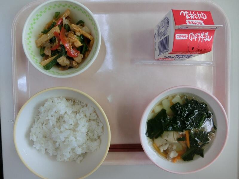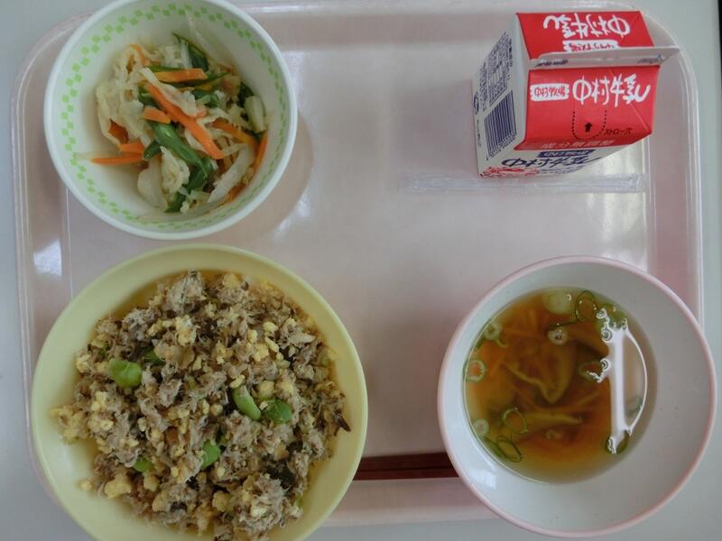 五目ご飯は「炊き込みご飯」の一つで、「かやくご飯」と呼ばれることもあります。「炊き込みご飯」は、いろいろな具と調味料を一緒に入れてご飯を炊きます。五目とは五品目の具が入っているという意味です。今日は、鶏肉、にんじん、ごぼう、しいたけ、青豆を使っています。給食では、調理の都合上、ご飯を炊いてから、煮込んだ具と混ぜています。子どもたちは、五品目の具をおいしそうに食べて、栄養をしっかりとり、午後の授業も頑張っていました。
