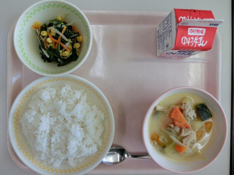 今日の給食には、かぼちゃ・にんじん・ほうれん草など色の濃い野菜がたくさん入っています。これらの野菜は緑黄色野菜といって、目を元気にする栄養素、ビタミンAがたくさん入っています。子どもたちは、体によい食材をしっかり食べて、午後も元気いっぱいの姿を見せてくれました。