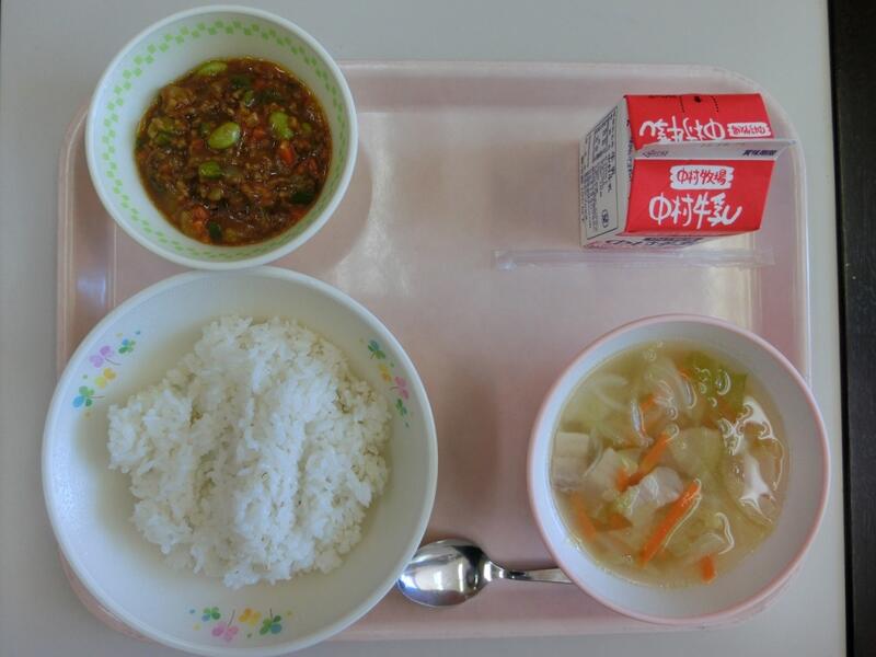 今日の献立のキムチ豚丼は、初めてのメニューです。今日の豚丼には、マヨネーズが入っているので、キムチのピリ辛がまろやかな味になっています。また、肉以外に野菜も入っていて、栄養たっぷりです。子どもたちは、キムチ豚丼をおいしそうにほおばって、午後の授業も元気に頑張っていました。