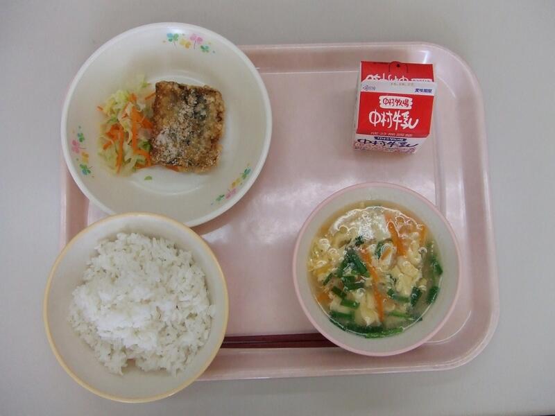 今日の給食の竜田揚げは、奈良県にある竜田川の自然の色に由来しています。先に、下味をつけてから揚げます。揚げた色合いが、竜田川とそこに流れる紅葉に似ていることから「竜田」という名前がついたそうです。竜田揚げのサクサク感がおいしさを更に引き立てていました。