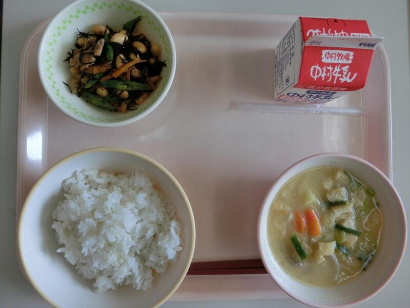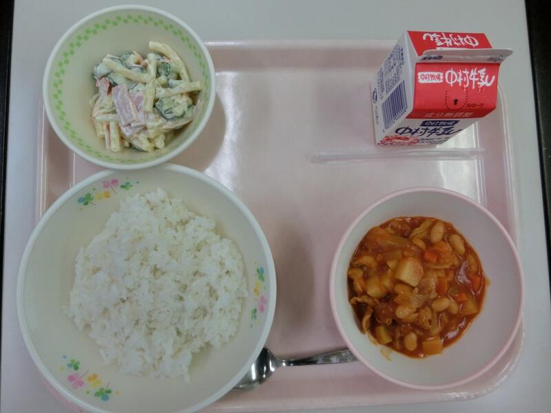 今日の「ポークビーンズ」とは、豆のことです。今日は、白いいんげん豆を使っています。豆は、肉に負けないくらいたんぱく質をたくさん含み、また肉にない食物せんいやビタミン・カルシクムなどがあります。健康にとても役に立つ食べ物です。子どもたちは、今日も栄養たっぷりの給食をしっかりと食べていました。